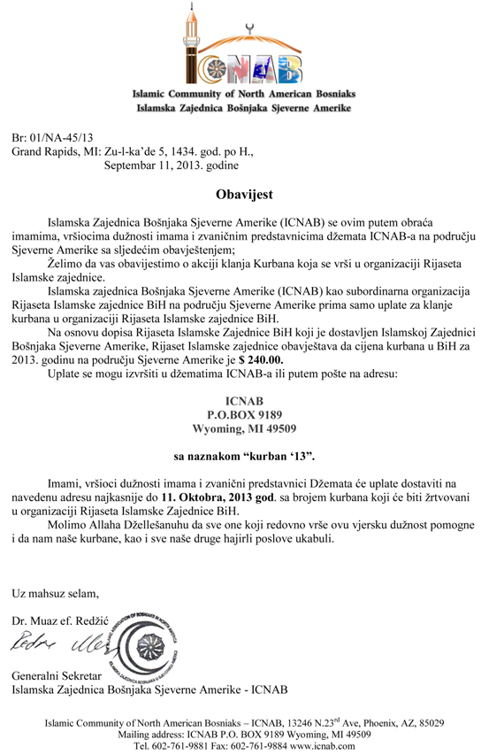Islamska Zajednica Bošnjaka Sjeverne Amerike (ICNAB) se ovim putem obraća imamima, vršiocima dužnosti imama i zvaničnim predstavnicima džemata ICNAB-a na…
