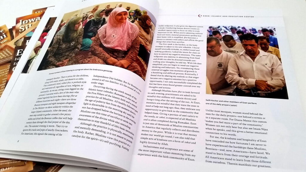 Istinitost ovih riječi potvrdjuje knjiga/udžbenik u izdanju Drake Univerziteta koja je svjetlo dana ugledala jučer, u četvrtak 6. aprila 2017. godine u kojoj je opisana bosanska kula odnosno Islamsko-edukativni centar EZAN u Des Moines-u baš u pravom svijetlu, te u kojoj je jasno i nedvosmisleno spomenut počinjeni genocid nad Bošnjacima.