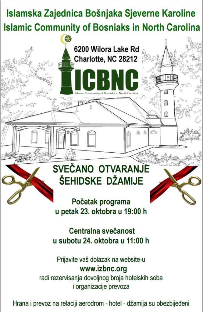 Džemat Islamske Zajednice Bošnjaka Sjeverne Karoline (Islamic Community of Bosniaks in North Carolina – ICBNC) je zakazao svečano otvaranje naše Šehidske dzamije u Šarloti za 23. i 24. oktobar 2015. godine. (Petak navečer do Subote navečer), te poziva zaintersovane Bošnjake da se priključe ovom svečanom činu u velikom broju kako bi smo, ako Bog da, zajedno uveličali otvor još jedne kuće uzvišenog Allaha dž.š..